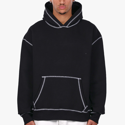 سويت شيرت رجالي بهودي أسود بغطاء رأس مع جيب أمامي أبيض ومزينة برباط قابل للتعديل سويتشويت شيرت